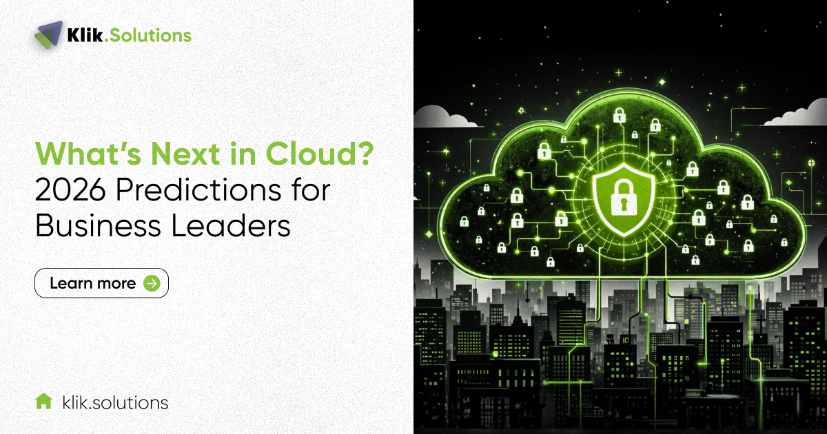 This article outlines the key cloud trends and predictions for 2026 that every CEO, CFO, and CTO must integrate into their strategic planning now. At Klik Solutions, we help businesses move from cloud complexity to intentional, business-aligned cloud strategy, ensuring they are running smart, not just running fast.